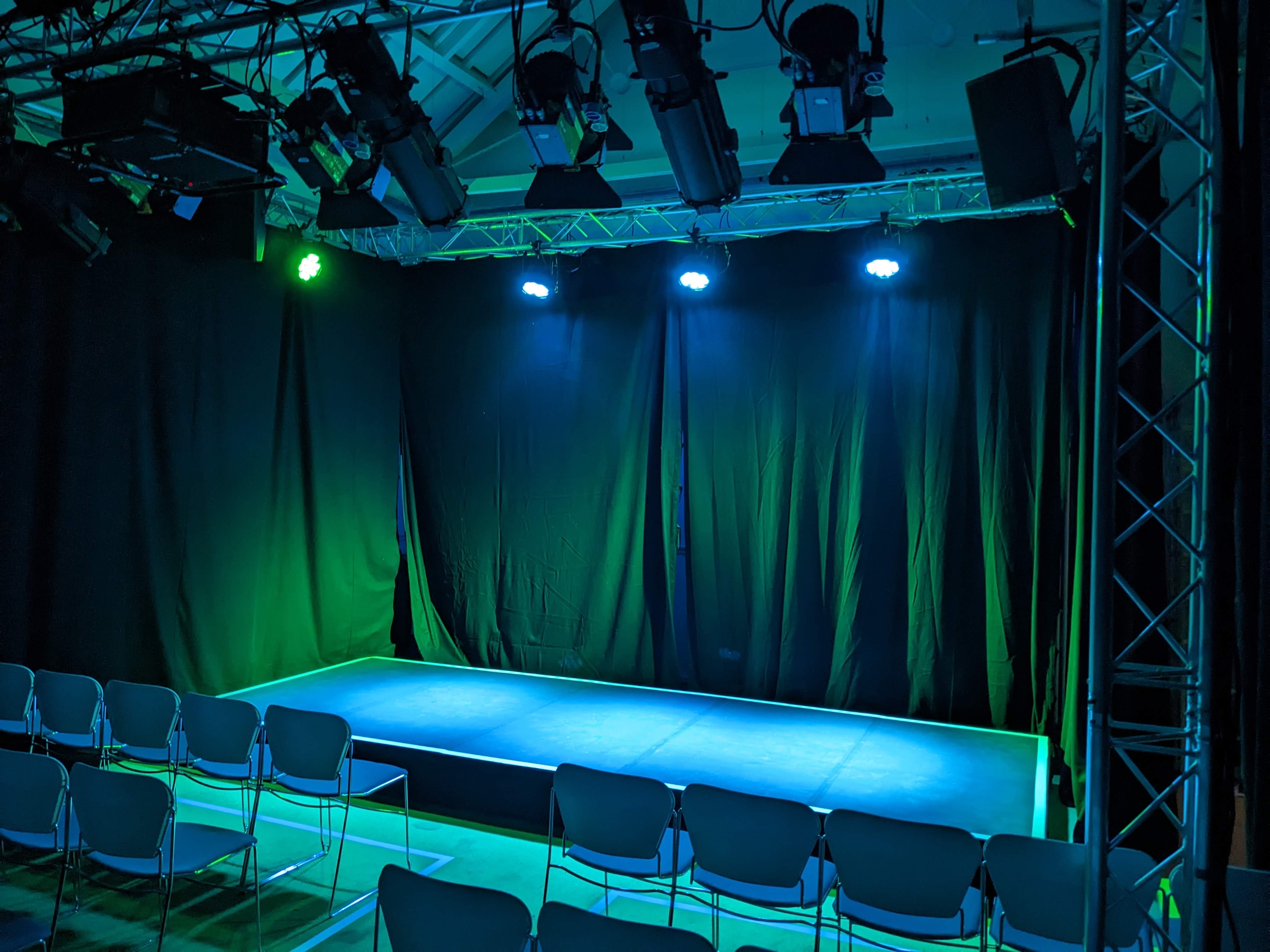 The venue has a complete and flexible LED-based lighting rig, fully equipped for any Fringe production. The rig is mounted on a truss structure that encloses the stage.