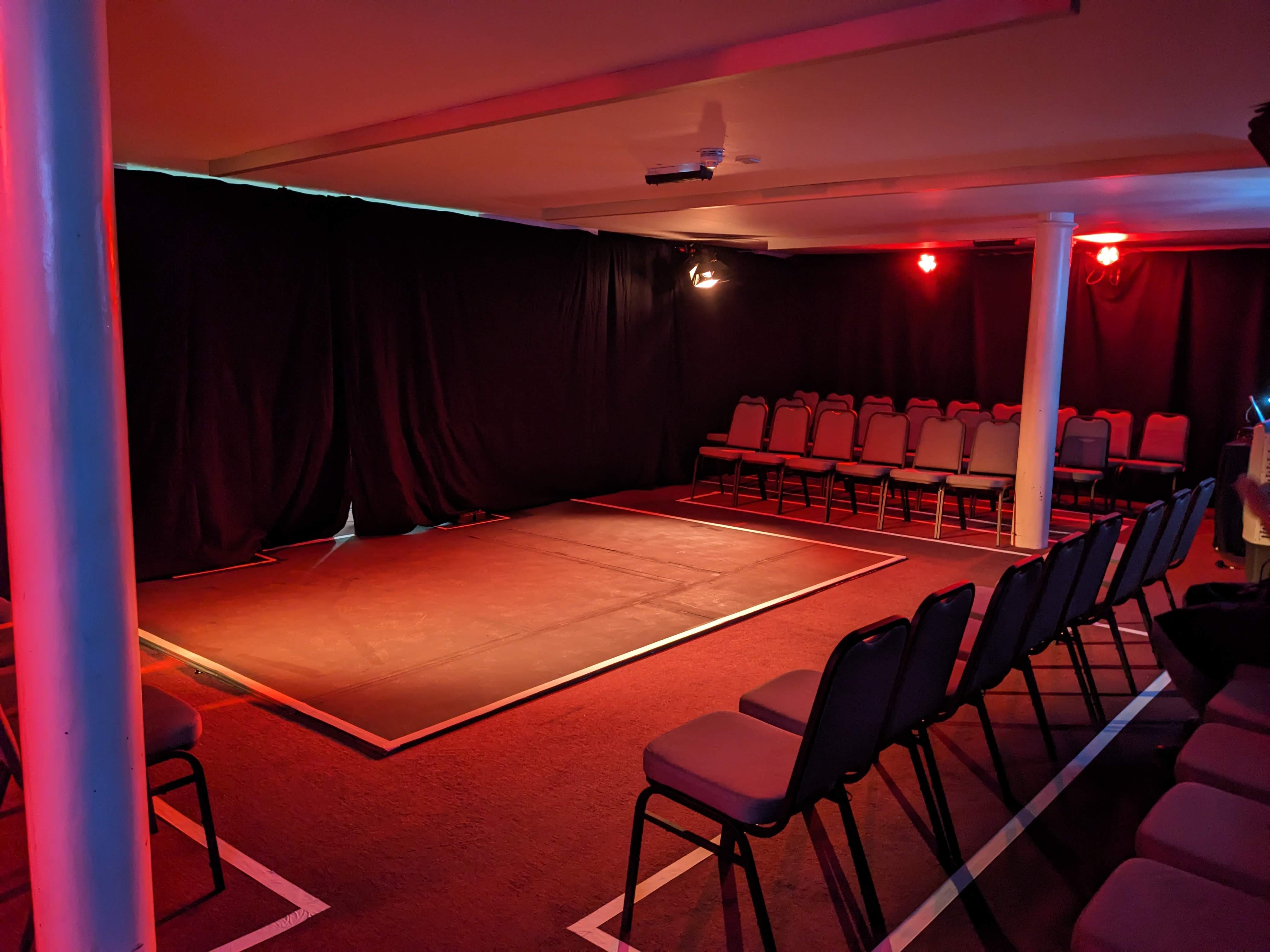 The venue is laid out in a mixed cabaret arrangement around a thrust stage measuring 3x4m, constructed of black painted boards with a height of 2cm. To preserve the finish please ensure your costume does not use shoes with stiletto heels. Small spike marks are permitted - we advise initialling them or using coloured tape to distinguish them, and cut rather than tearing for longevity.